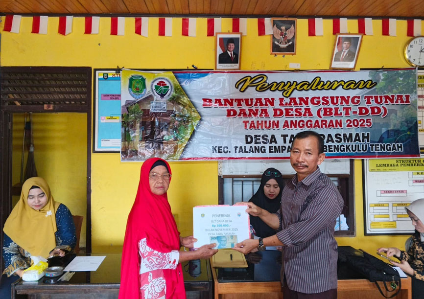 RAKYATBENTENG.BACAKORAN.CO - Pemdes Taba Pasmah menyalurkan Bantuan Langsung Tunai Dana Desa (BLT DD) untuk periode November 2025 kepada 13 Keluarga Penerima Manfaat (KPM) pada Kamis, 27 November 2025. Penyaluran berlangsung di Kantor Desa Taba Pasmah, Kecamatan Talang Empat, Kabupaten Bengkulu Tengah.